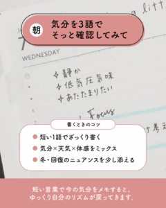 朝の気分を3つの言葉で確かめてみて。短く書くだけで心が整い、ゆっくりとリズムが戻ります。気持ちのスイッチがそっと入る朝の習慣です。