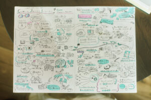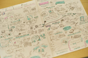 山下:クライアントとのワークショップ合宿でも、セッションごとに谷古がグラレコを描き、休憩時間に印刷して配る、ということをやったりしています。